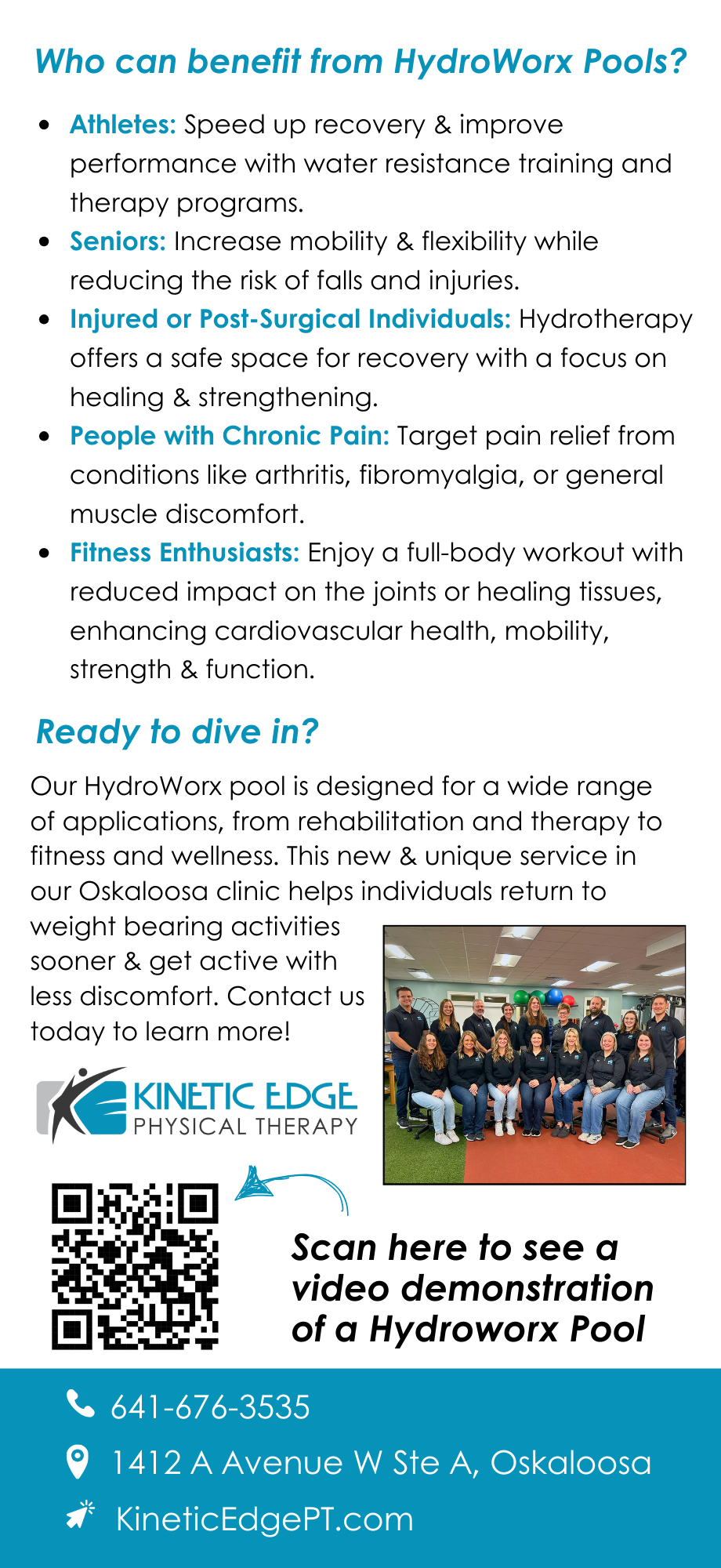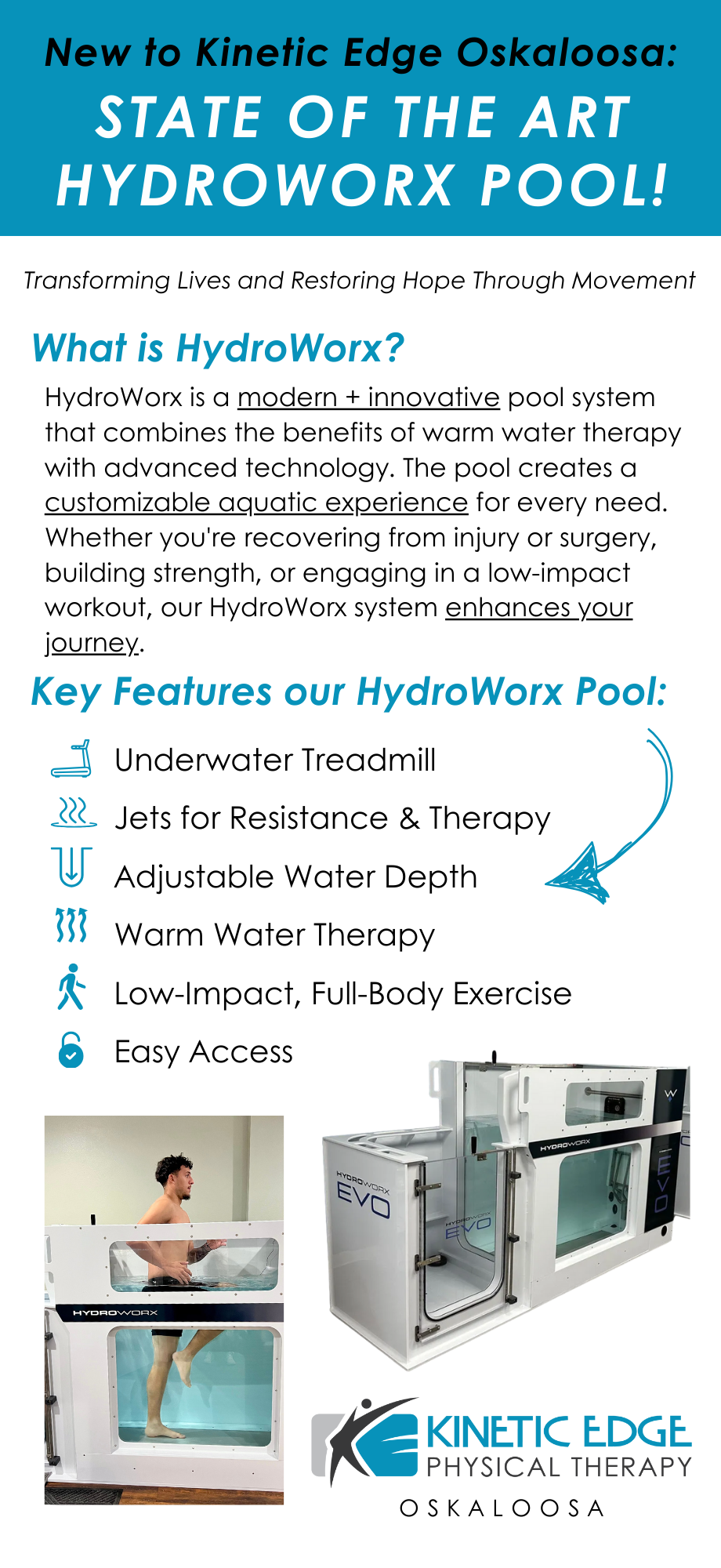 Recovery shouldn’t feel limiting. At our Oskaloosa clinic, we’ve added advanced HydroWorx aquatic therapy to help patients move with less pain, build strength safely, and regain confidence sooner. This state-of-the-art therapy pool allows for low-impact movement with real-time support from our therapists—making rehab more effective and accessible for all levels of recovery.